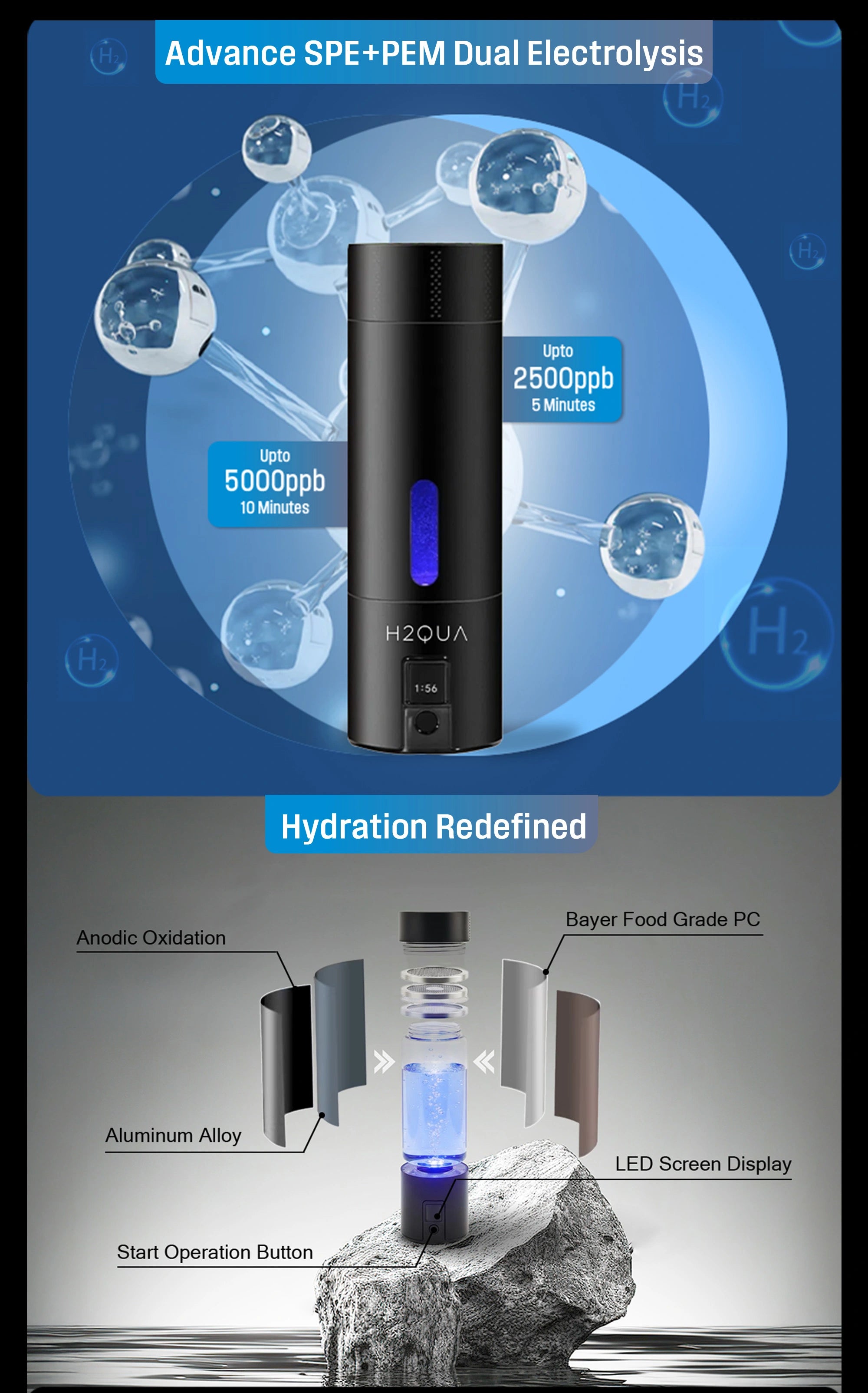 It uses food-grade materials, certified components, and safe electrolysis technology.